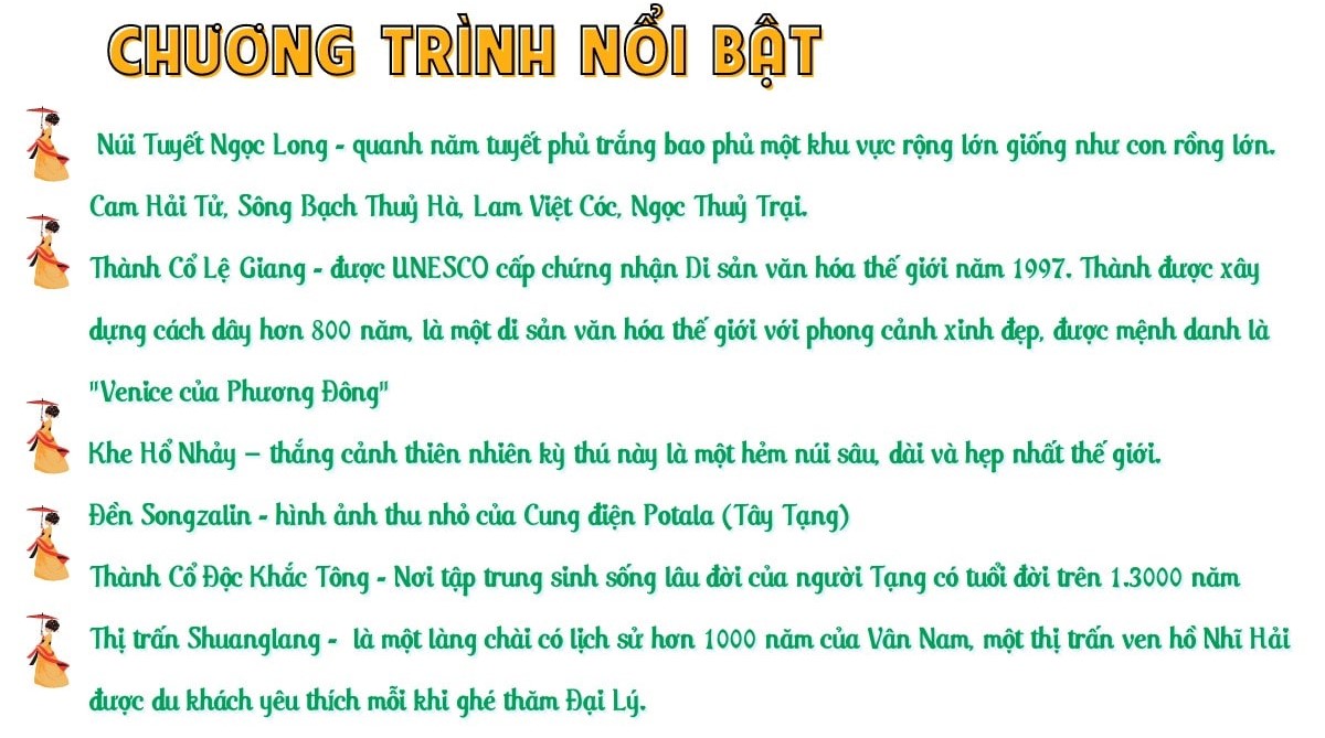 Lưu ý : Thứ tự các điểm tham quan có thể hoán đổi theo tình hình thực tế của thời tiết, giao thông, giờ bay của hãng hàng không … nhưng vẫn đảm bảo đầy đủ điểm trong chương trình!