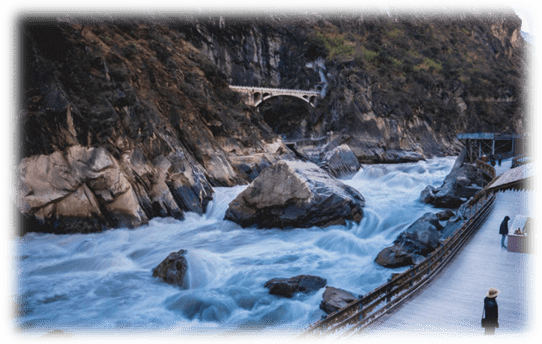 - Khe Hổ Nhảy - Khe Hổ Khiêu - Hổ nhảy(Tiger Leaping Gorge): thẳng cảnh thiên nhiên kỳ thú này là một hẻm núi sâu, dài và hẹp nhất thế giới. Nơi đâydòng sông Trường Giang bị chặn bởi hai dãy núi cao Ngọc Long (5600m) và Habar(5396m), đột ngột thót nhỏ lại một đoạn dài 16km, chiều sâu tính từ đỉnh núi xuống đáy hẻm là gần 3900m. Ngay đoạn hẹp nhất có một phiến đá lớn án ngữ, nước chảy xiết xô vào phiến đá tạo nên những âm vang trong khe núi. (Không gồm phí thang máy).