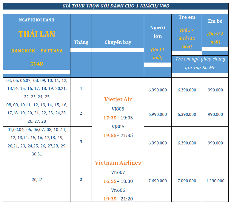 - Vé máy bay khứ hồi SÀI GÒN – BANGKOK – SÀI GÒN các hãng hàng khôngVietjet Air Hoặc VietNamAirlines(tùy ngày quý khách chọn: ngày khởi hành - hãng bay - giờ bay theo lịch khởi hành bên trên).